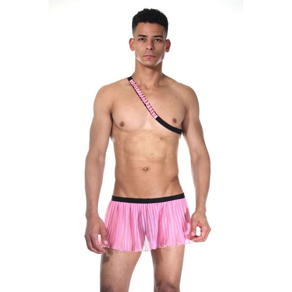 Эротичный костюм для мужчин, состоящий из розовой плиссированной юбки на черном поясе с открытыми ягодицами и черно-розовой повязки, которая одевается на верхнюю часть тела. В комплекте: юбка, наплечник.