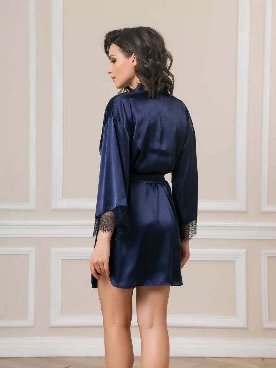 Короткий халат на запах из искусственного шелка с поясом, декорированный кружевом по рукаву.