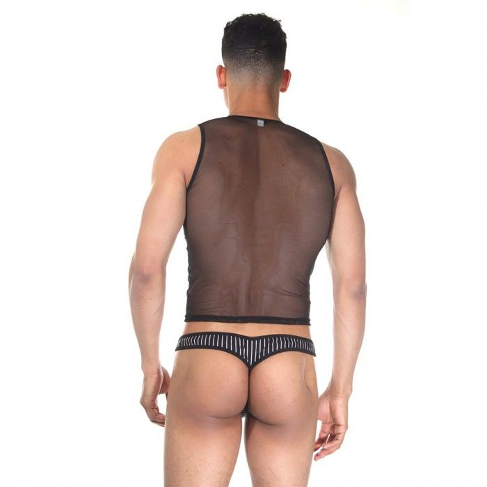 Мужской комплект, состоящий из трусов-тонг, черных в тонкую белую полоску, и короткой майки на широких лямках. Сама майка из полупрозрачной тонкой очень мелкой сетки, на плечах вставки из материала в белую полоску, такого же, как на тонгах. В комплекте: майка, трусы.