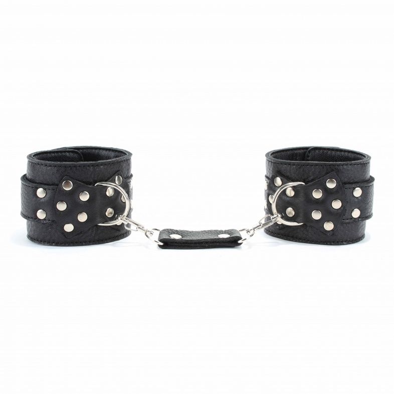 Кожаные наручники черного цвета. Украшены заклепками и соединяются между собой цепью с карабинами/ Размер наручников регулируется при помощи застежки Ширина - 6 см. Длина цепочки - 15,5 см.
