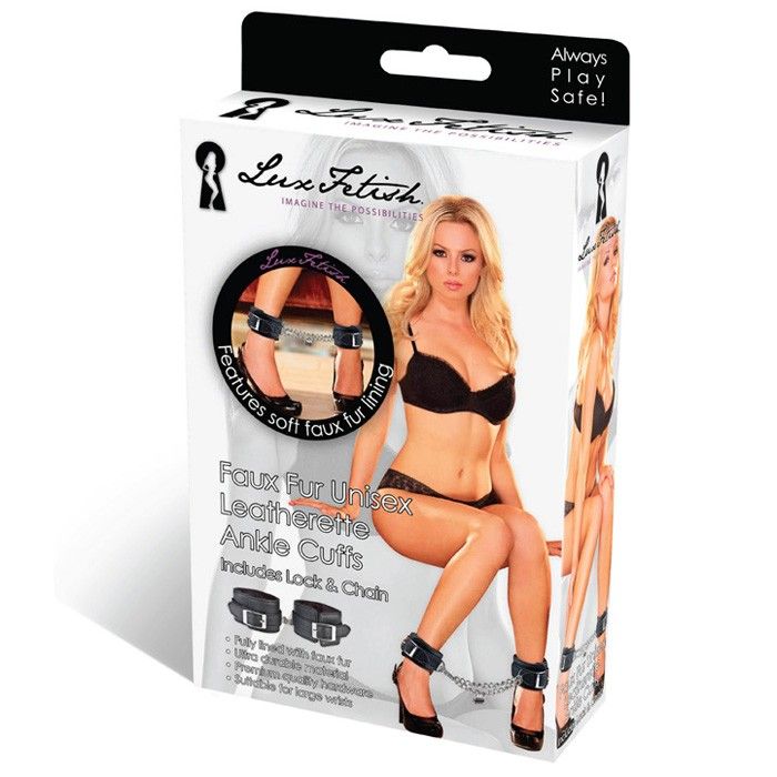 Черные фиксаторы для ног из искусственной кожи с мягким черным мехом внутри для большего комфорта при сковывании Вашего партнера. Между собой браслеты соединяются металлической цепью с крупными звеньями, застегиваются на замок с ключами (есть в комплекте). One size.