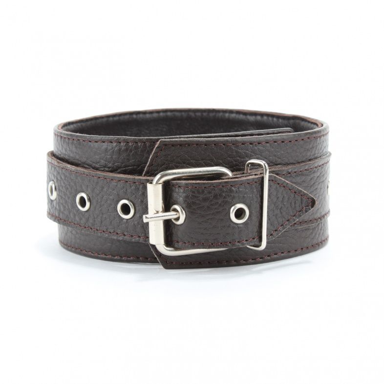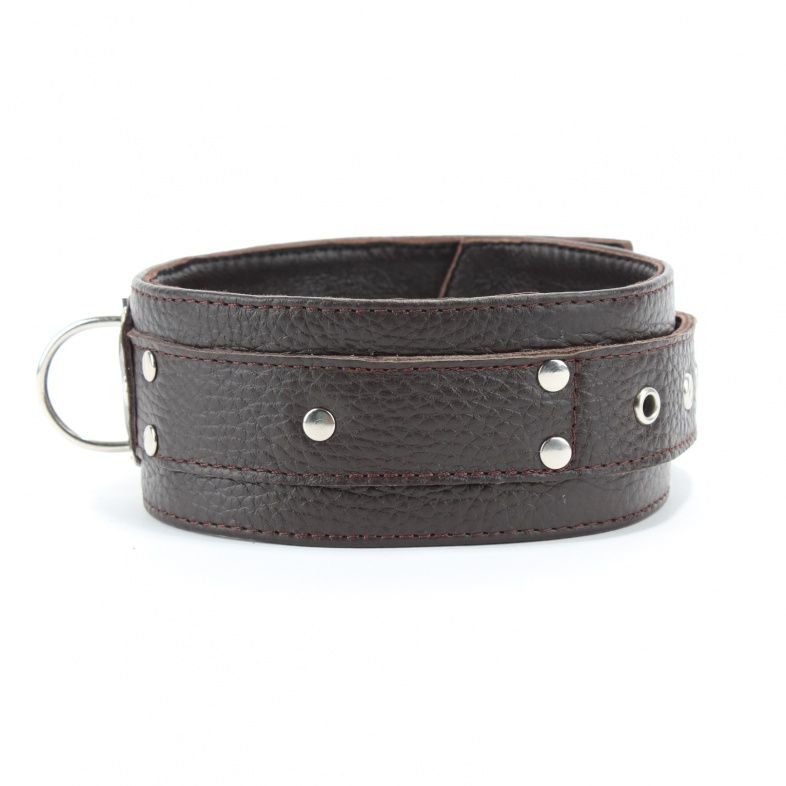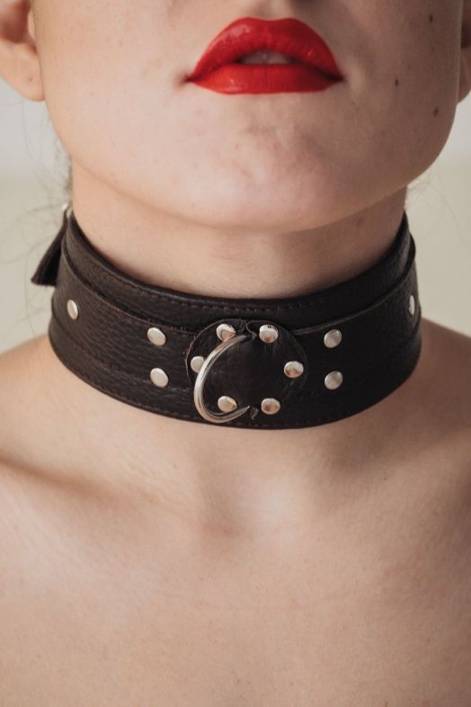 Широкий черный ошейник из мягкой кожи. Застегивается на пряжку. Впереди - скоба, к которой можно прикрепить поводок или наручники.
